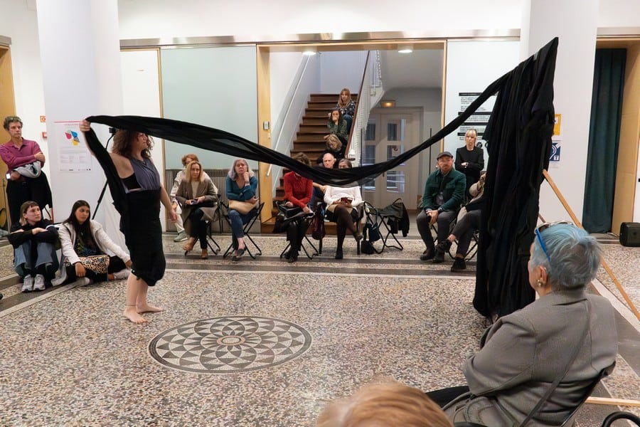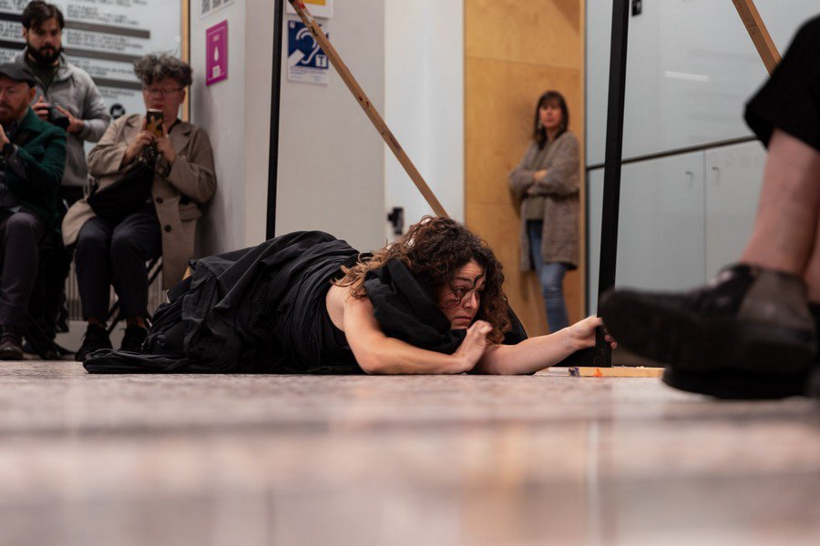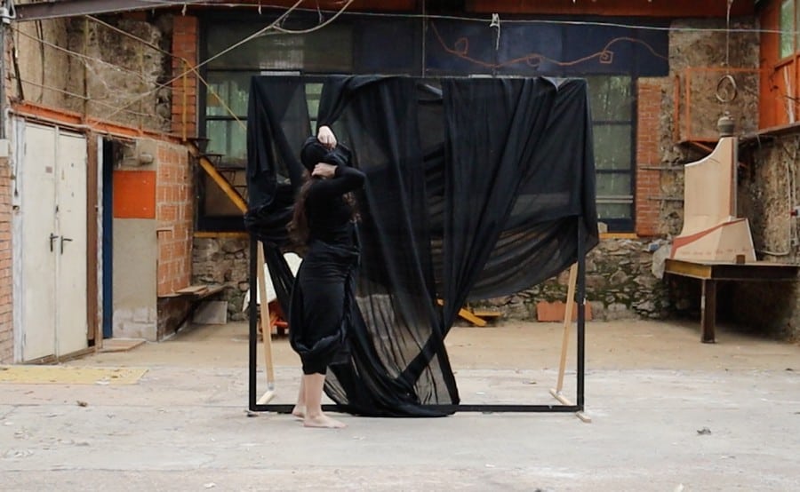 Esta obra es un rito, un diálogo, una huída. A través de sonidos y mediante la acción, la artista trata de desatarse del tejido opresor. Silencio, música, palabra, ruido… van generando el camino del movimiento hacia un destino en el que, lo que se desata, propondrá como una nueva trama, una nueva imagen.